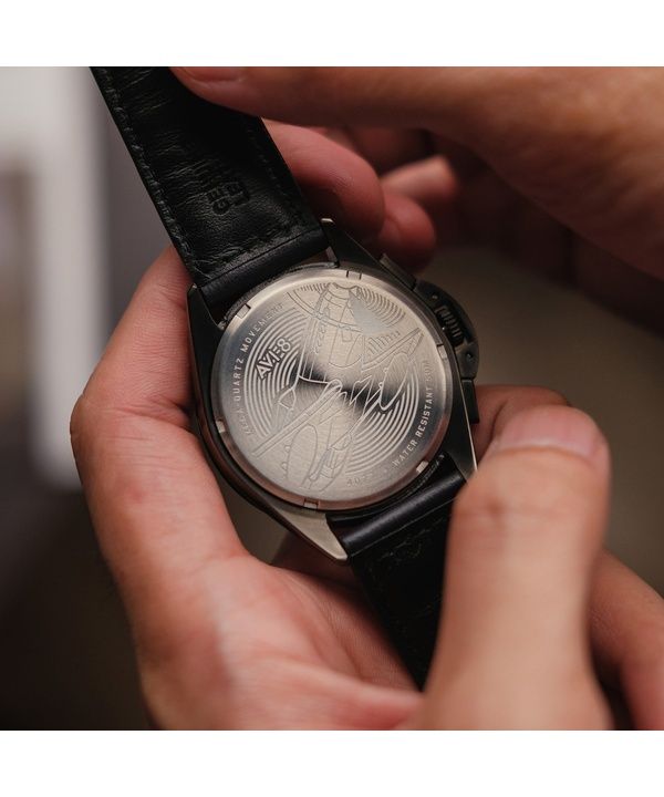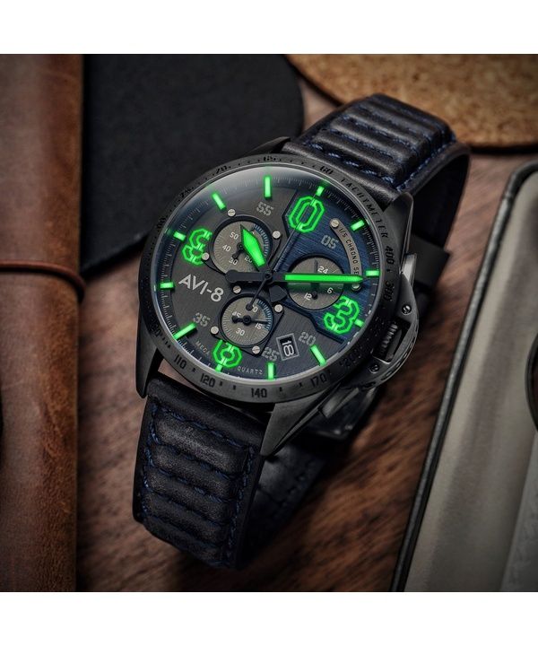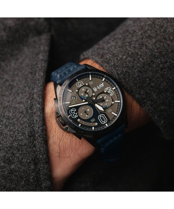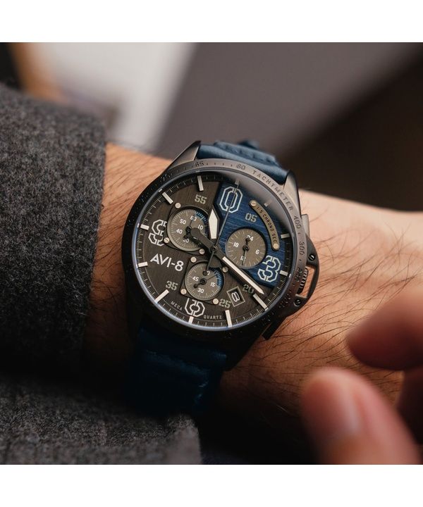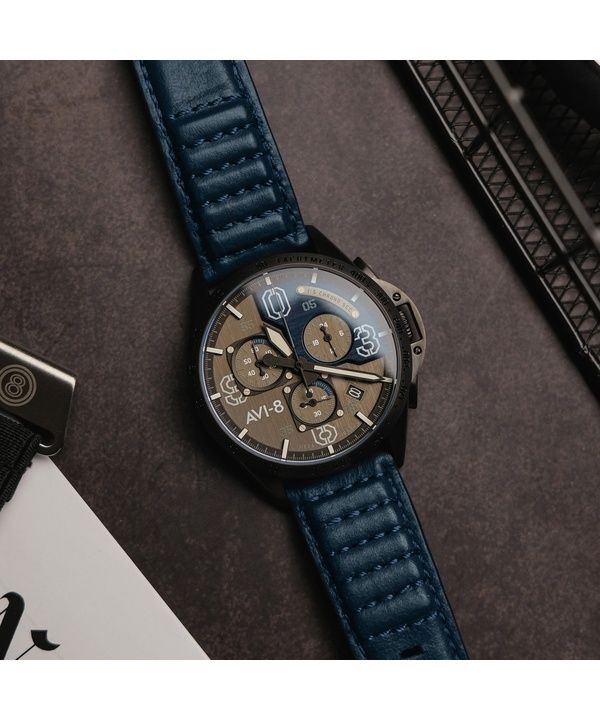 AVI-8 P-51 Mustang Blakeslee Chronograph Air Blaues Lederarmband Graues und blaues Zifferblatt Quarz AV-4077-04 Herrenuhr