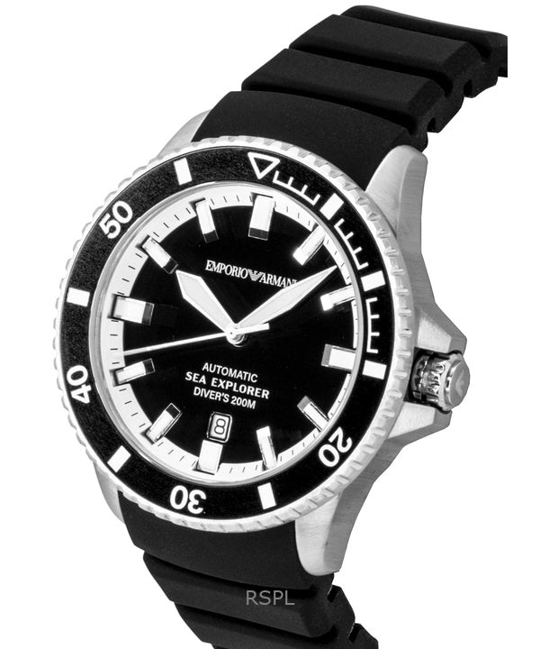 Emporio Armani Sea Explorer Herrenuhr mit Silikonarmband, schwarzem Zifferblatt, Automatik, Taucheruhr AR60086, 200 m wasserdicht