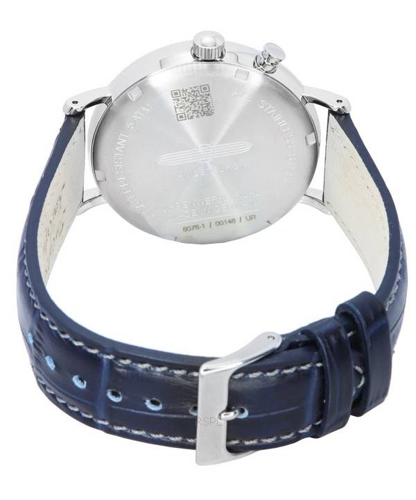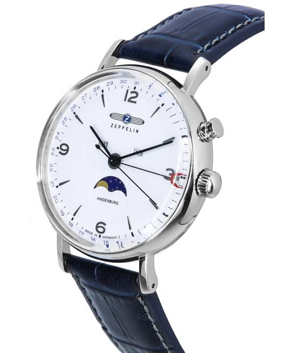 Generalüberholte Zeppelin LZ 129 Hindenburg Herrenuhr mit Lederarmband, Mondphase, weißem Zifferblatt und Quarzwerk (Ref. 80761).