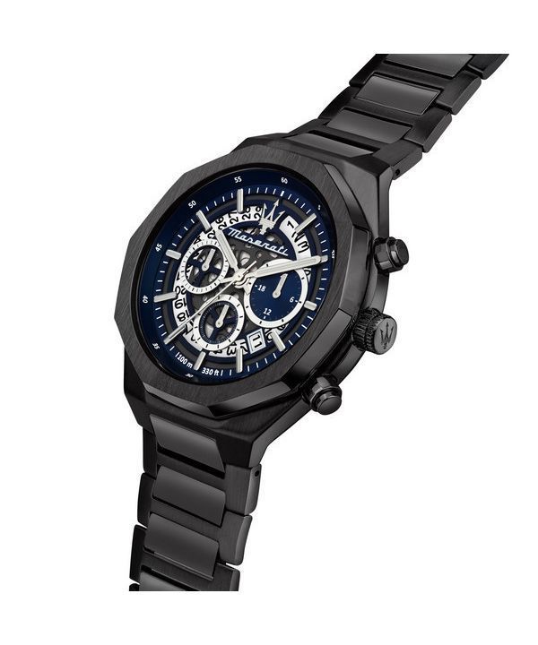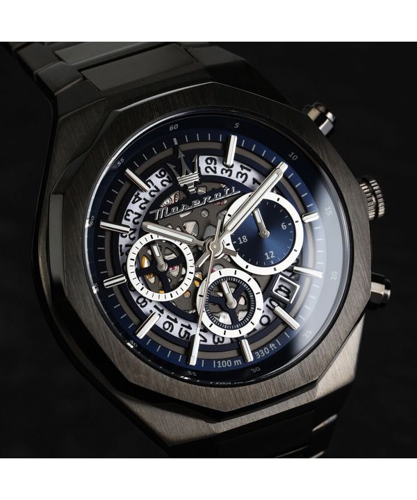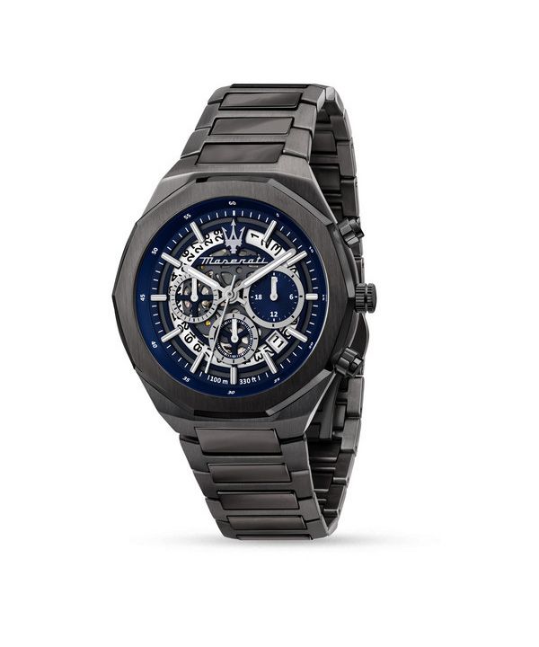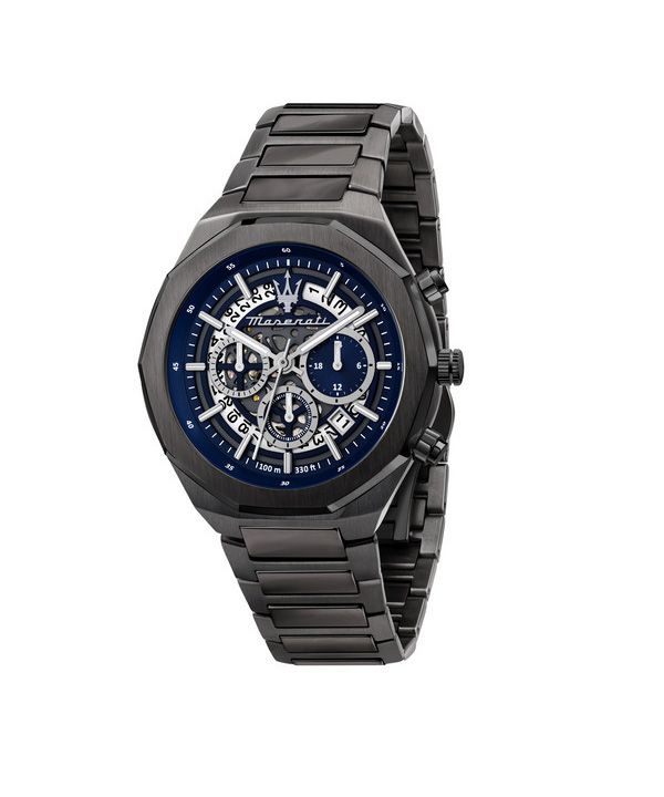 Maserati Stile Chronograph, Edelstahl, blaues Skelett-Zifferblatt, Quarz, R8873642012, 100 m, Herrenuhr