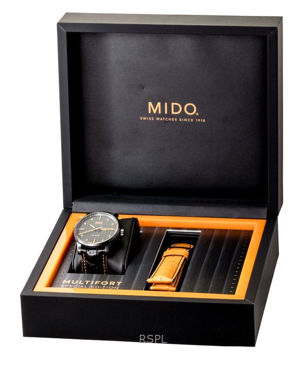 Mido Multifort Special Edition Herrenuhr mit Lederarmband, schwarzem Zifferblatt, Automatikwerk M005.430.36.051.80, wasserdicht bis 100 m, inklusive Ersatzarmband