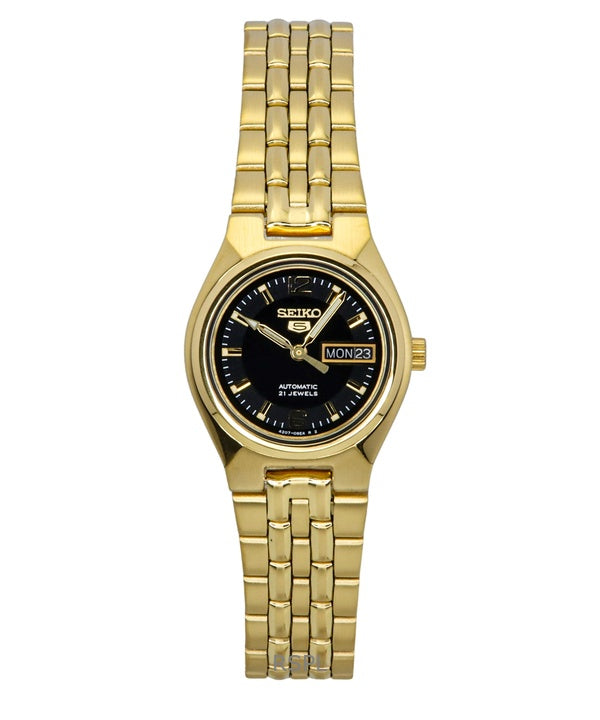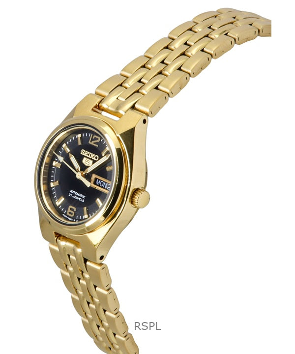 Seiko 5 Goldfarbene Edelstahl-Automatikuhr mit schwarzem Zifferblatt SYMK38K1 für Damen